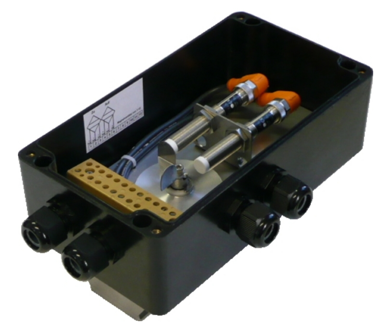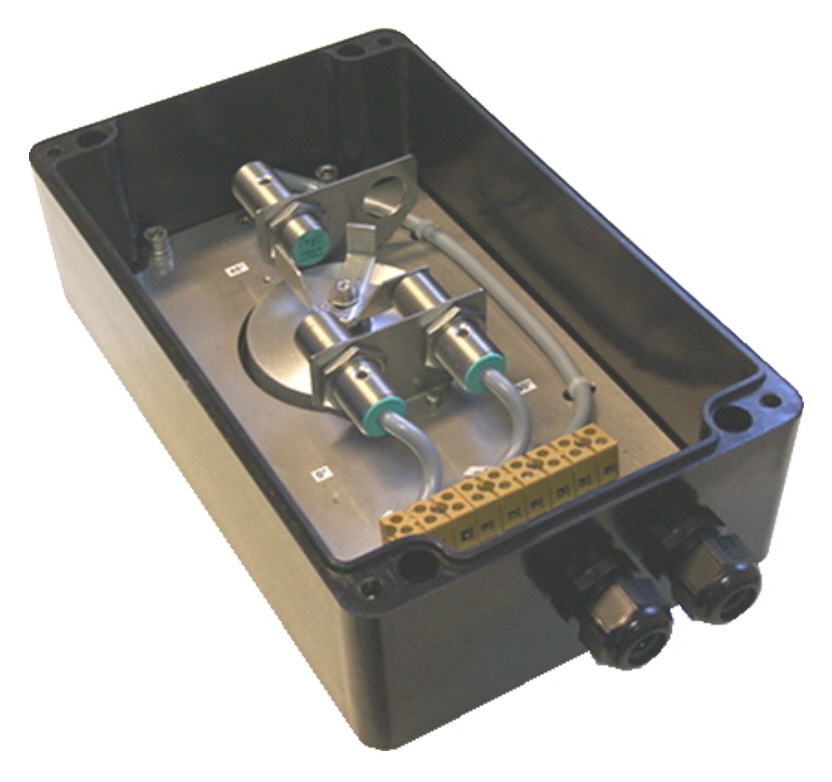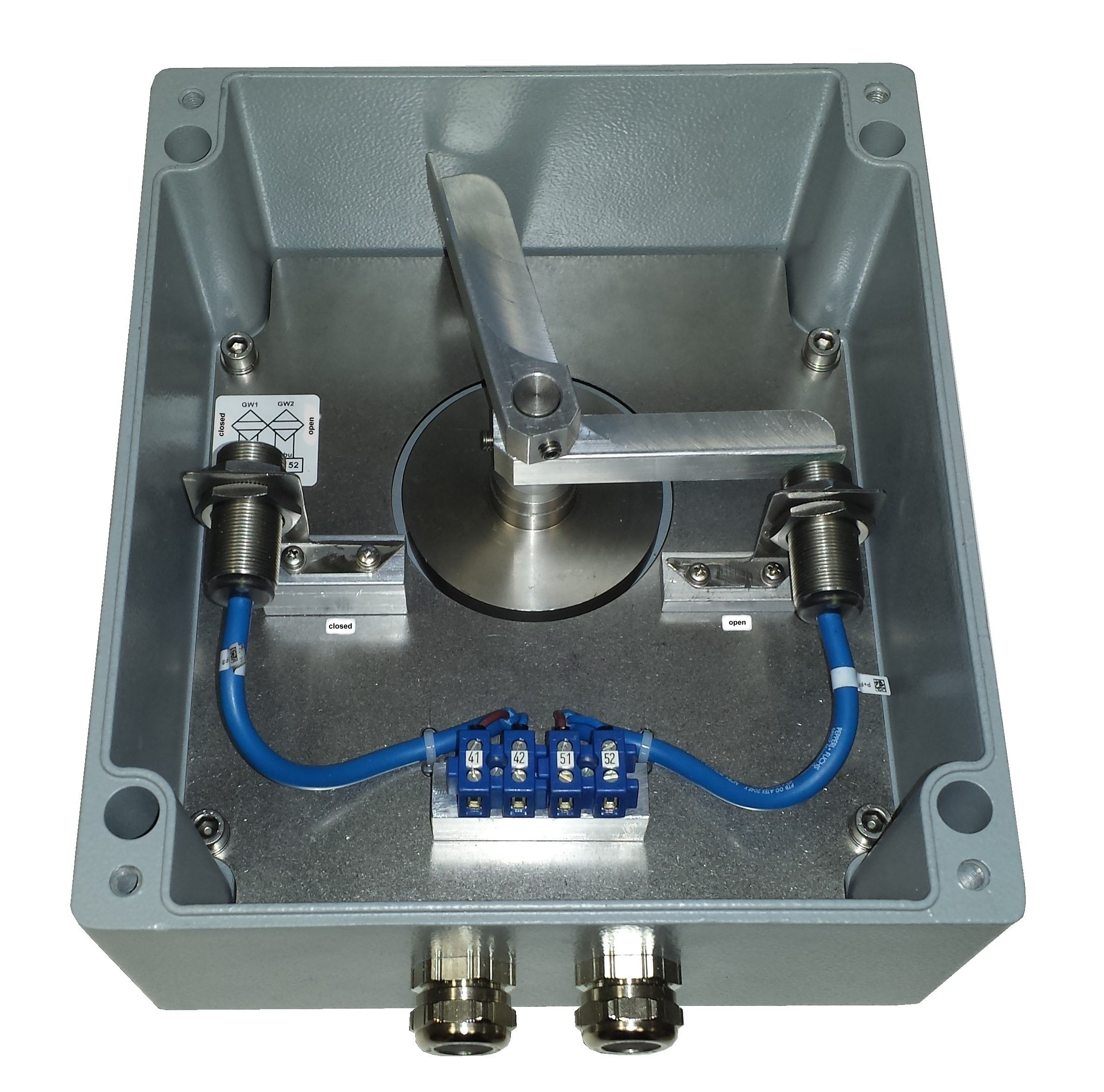 Stainless steel limit switch box for the application in the iron industry and steel industry, e.g., raw gas flaps, 3 lever flaps, glasses racketeers. A big switch distance of 10 mm is given by the built-in inductive Pepperl+Fuchs sensors NBB10-30GK50-E2. Through this the armature positions can be started with the variably adjustable switch flag perfectly and be reported back.