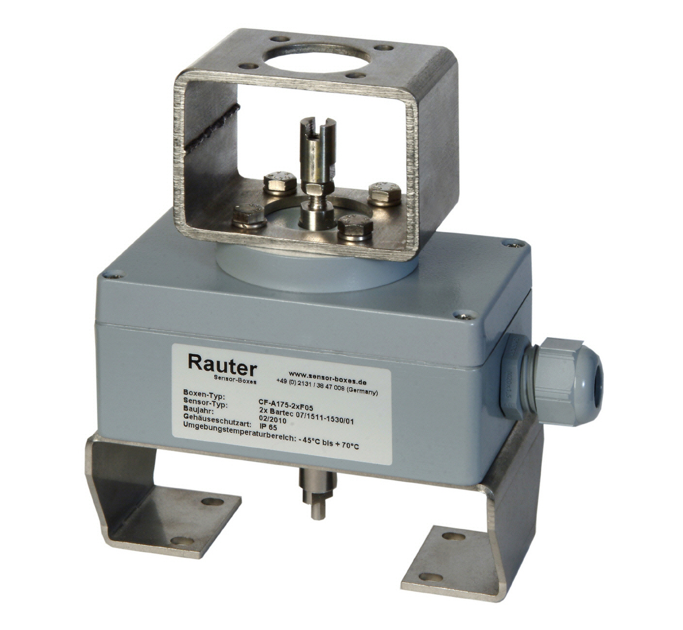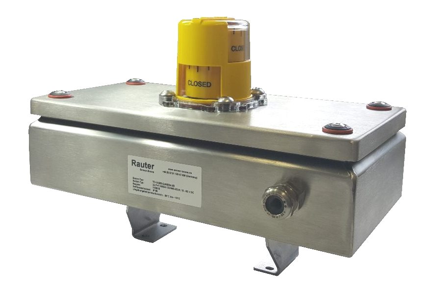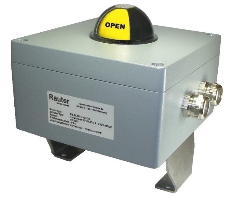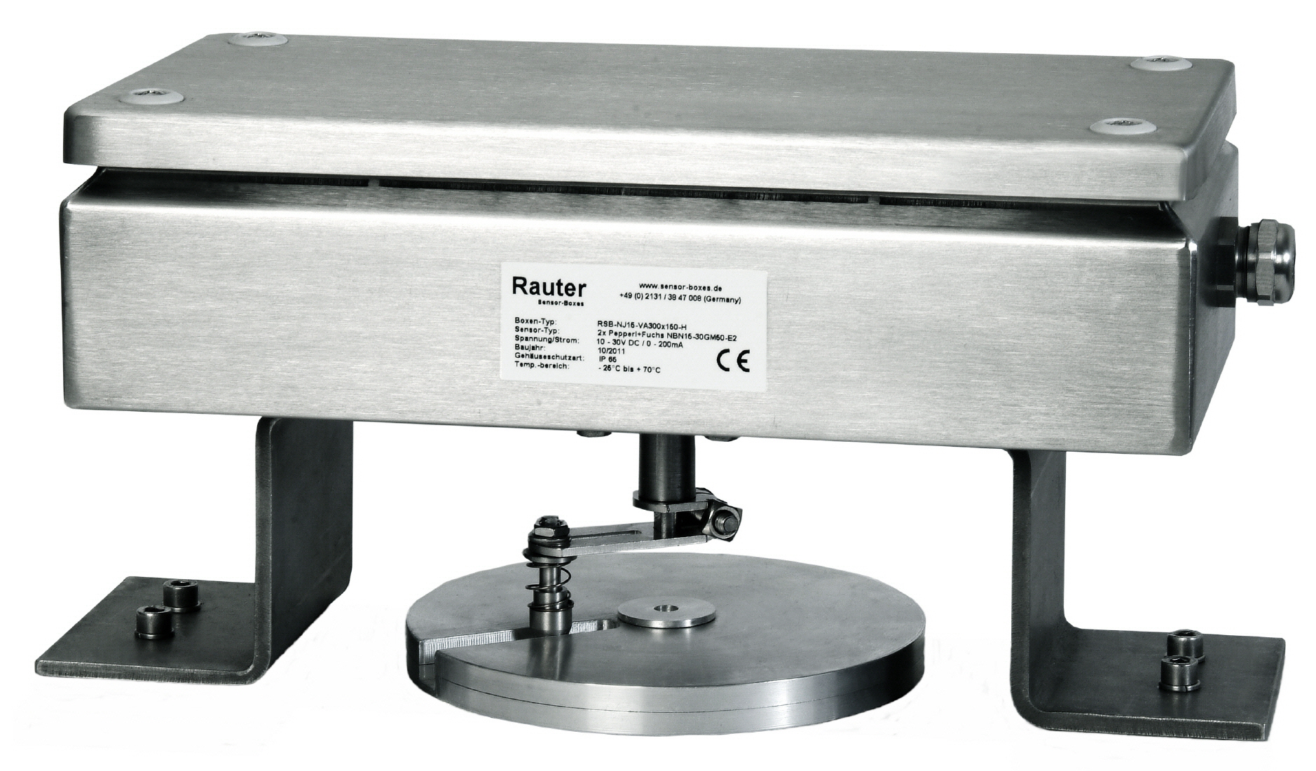 Stainless steel limit switch box for the application in the iron industry and steel industry, e.g., raw gas flaps, 3 lever flaps, glasses racketeers. A big switch distance of 10 mm is given by the built-in inductive Pepperl+Fuchs sensors NBB10-30GK50-E2. Through this the armature positions can be started with the variably adjustable switch flag perfectly and be reported back.