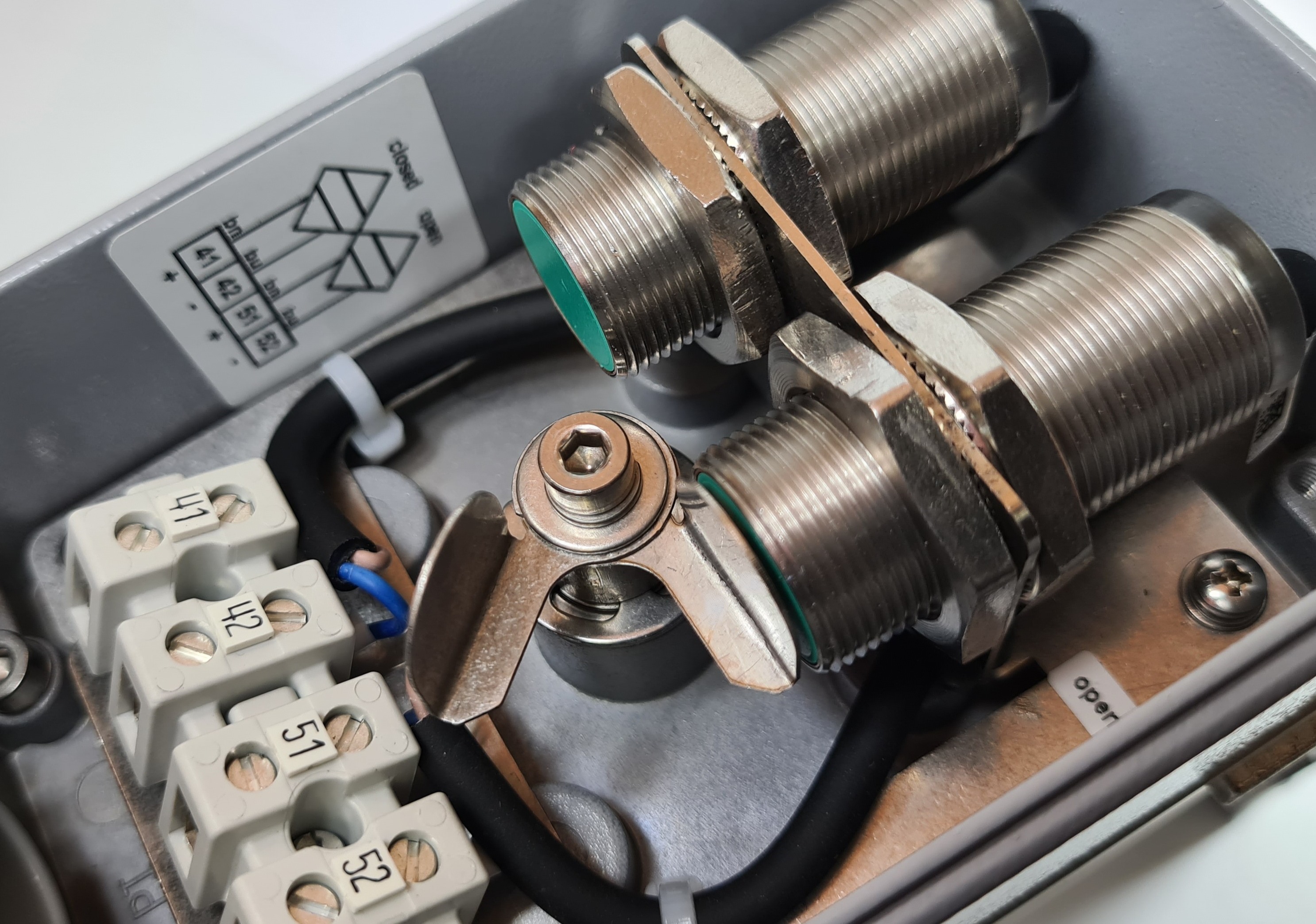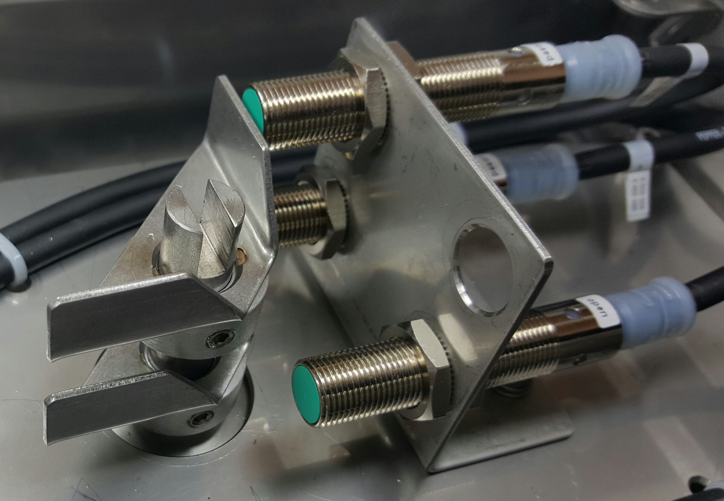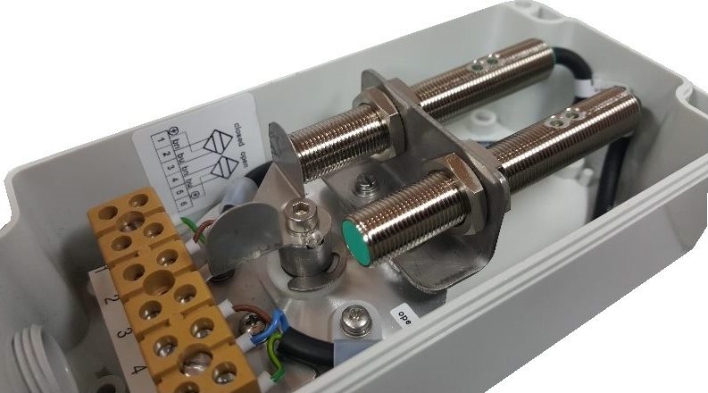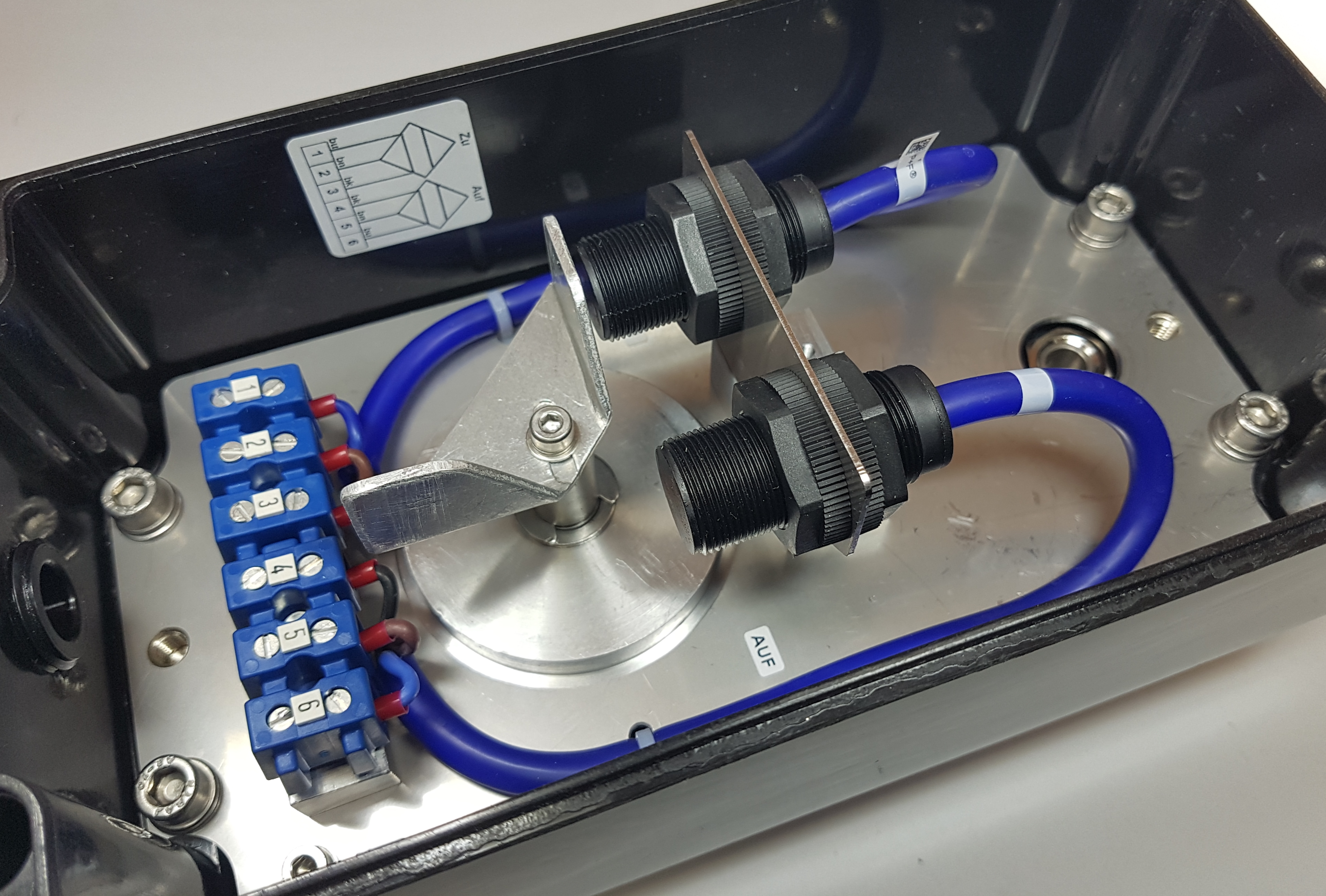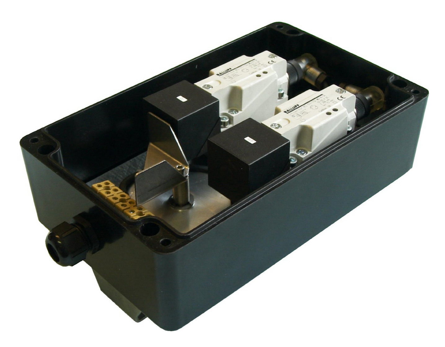 Limit switch box with inductive Balluff sensors for position open and closed.