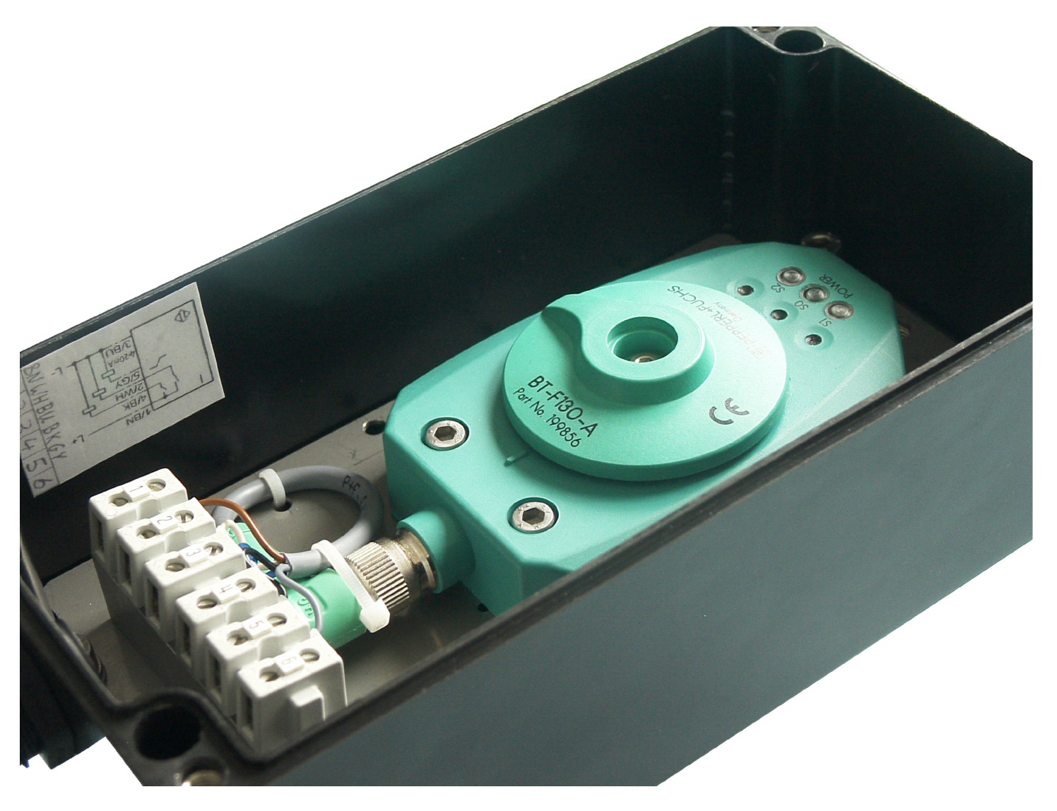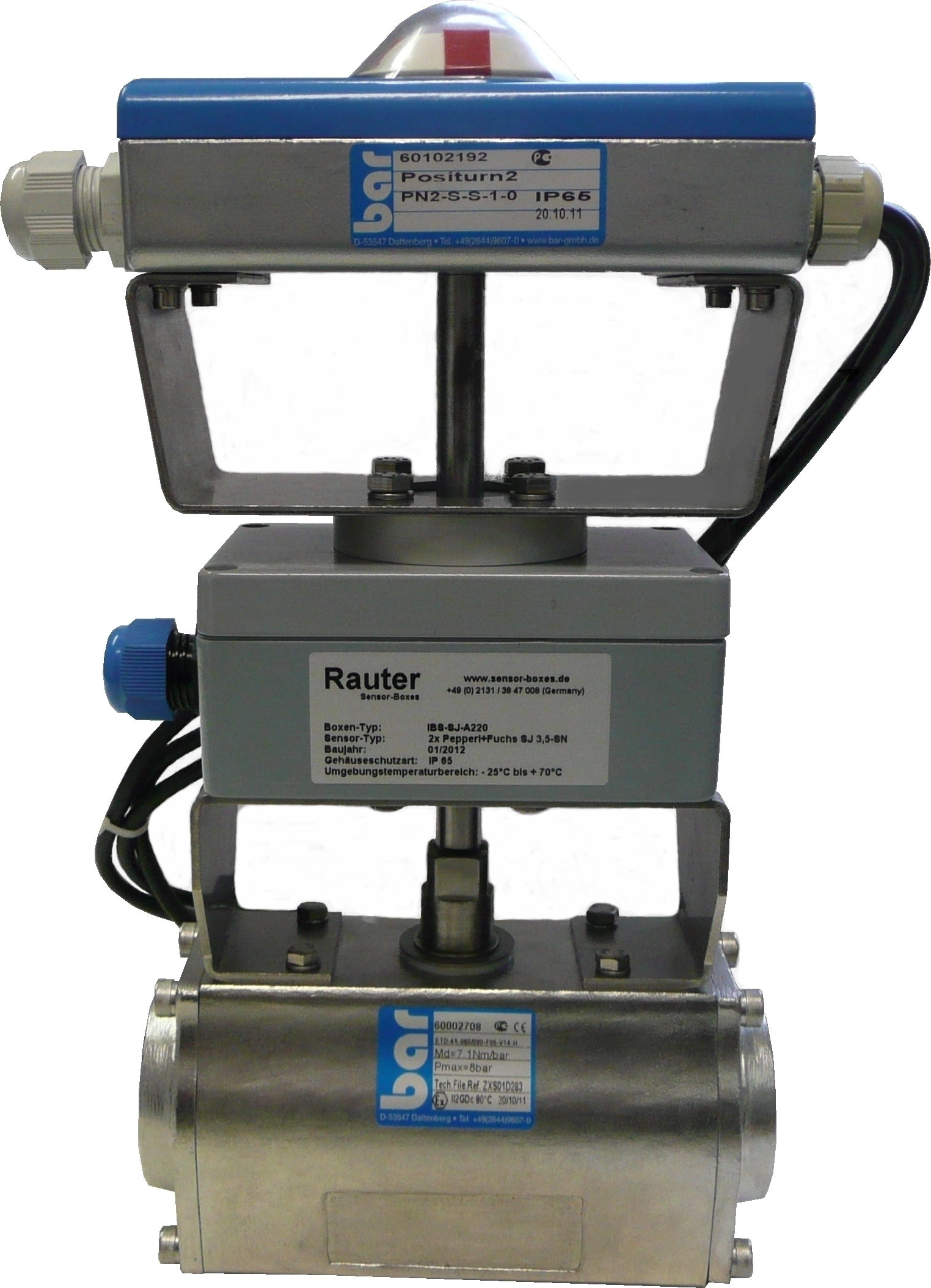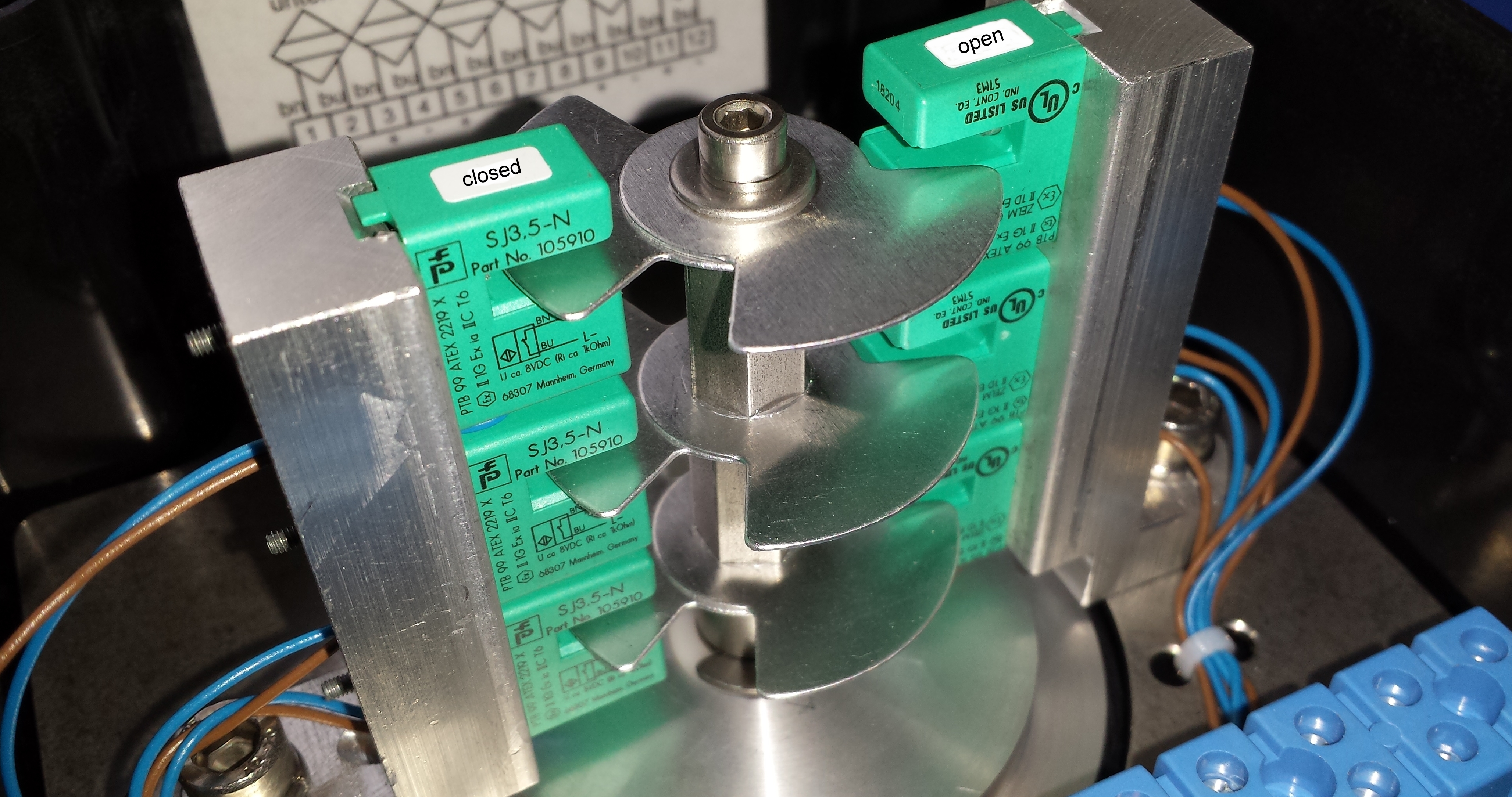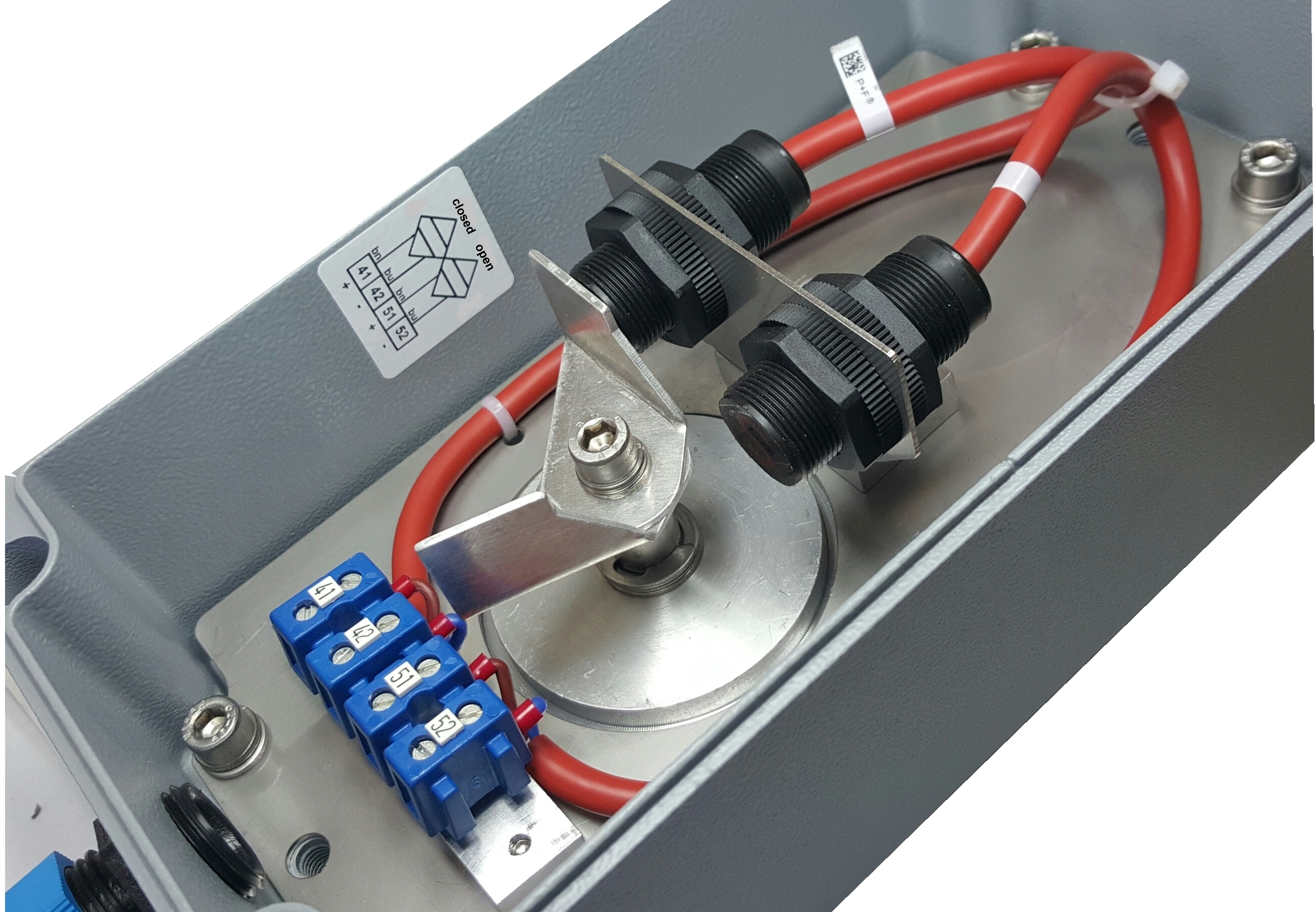 Limit switch box with inductive P+F sensors for position open, 45° and closed.