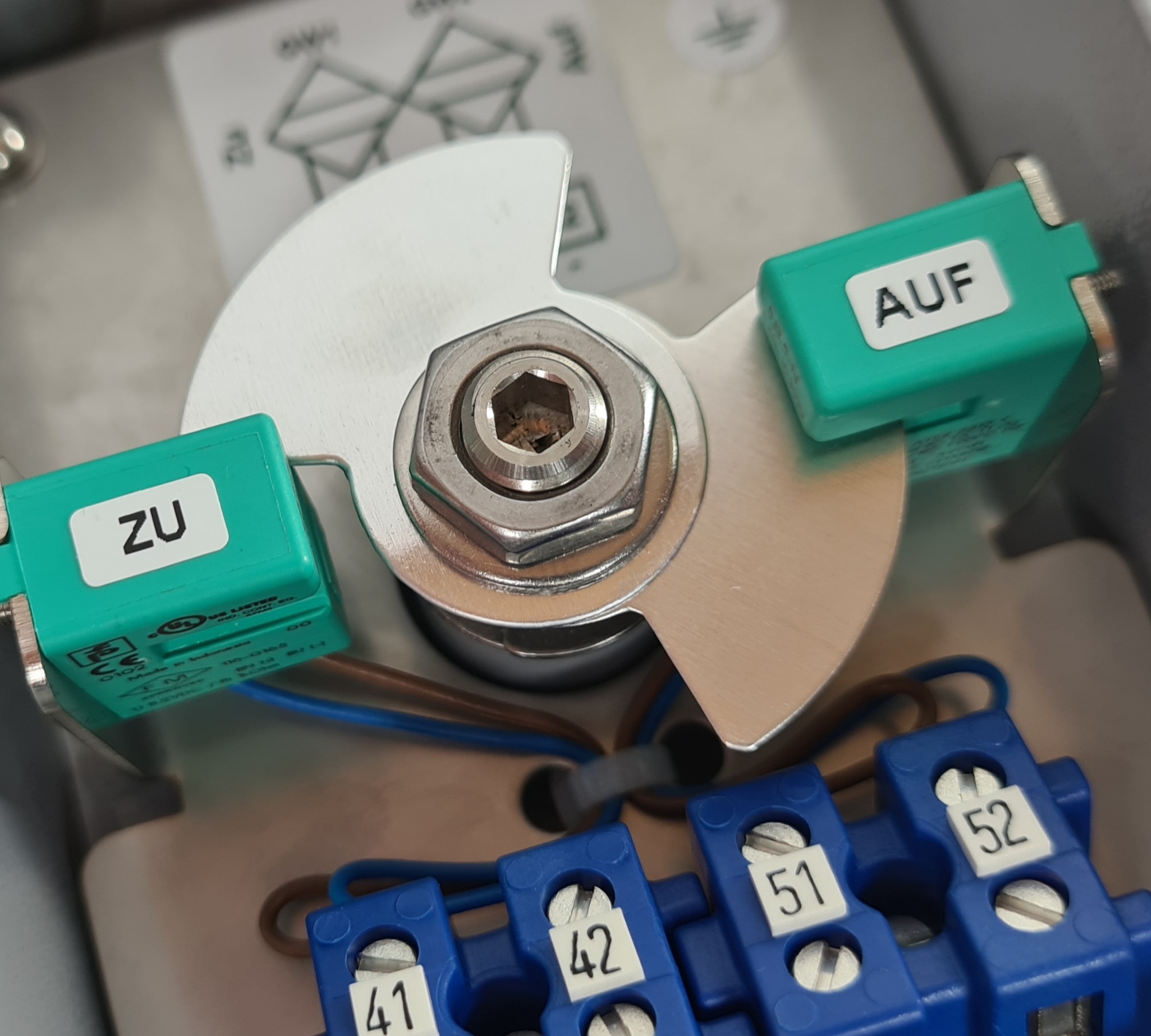 Ausgestattet ist der Positionsrückmelder mit 2x Ex i ... 8 V DC Pepperl+Fuchs Sensoren SJ 2-SN für die Positionen Auf und Zu. Die Aluminium-Schaltfahnen sind unabhängig voneinander einstellbar.